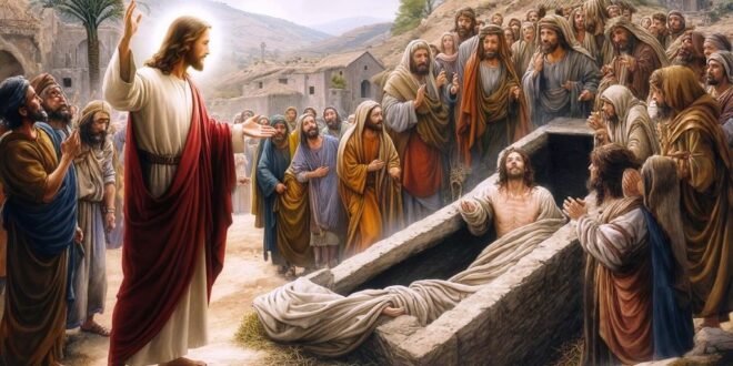 Han pasado cuatro días desde que Lázaro a muerto, cuando Jesús llega a Betania. Las dos hermanas tienen actitudes diferentes. Marta ha ligado su fe a la presencia física y real de Jesús. Esta fe es imperfecta y Jesús quiere llevarla a un cambio total en su fe. Hay un misterio que comienza a develarse: El de la resurrección. Jesús es la vida duradera para quien cree en Él, y esto libera en su sentido de los últimos tiempos. Pero esta fe, tiene ahora un nuevo sentido en Cristo, el Señor. Gracias a la venida de Jesús a introducirse en nuestro tiempo, en nuestro mundo, Él pagó el rescate por toda la humanidad, liberándolo de la muerte que nos había atrapado. (Sería bueno recordar que en la época que había esclavos, para liberarlos, había que pagar un rescate, aquí está la teología de fondo, que nosotros que éramos esclavos del pecado y su consecuencia la muerte, ya hemos sido liberados, comprados –por decirlo de otra forma- con la Sangre de Cristo). La vida con mayúscula que Dios nos ofrece, ya no está fuera de nuestro mundo, porque el Hijo de Dios ha venido a nuestro mundo.