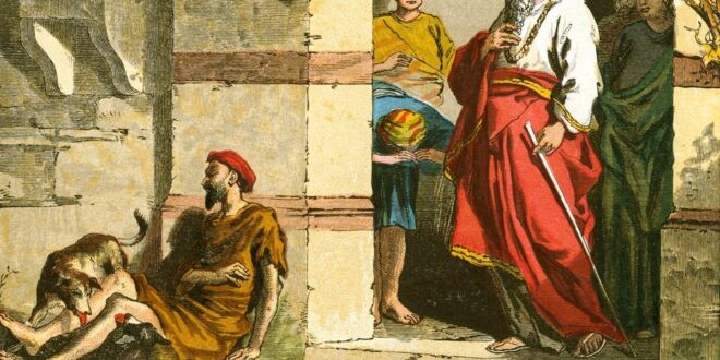 “Había un hombre rico que vestía con ropa muy cara y daba una gran fiesta todos los días. 20 A la puerta de su casa también había un mendigo, llamado Lázaro, cuyo cuerpo estaba cubierto de llagas. 21 Él hubiese querido llenarse el estómago con las migajas que caían de la mesa del rico. E incluso los perros se acercaban a él para lamer sus heridas.